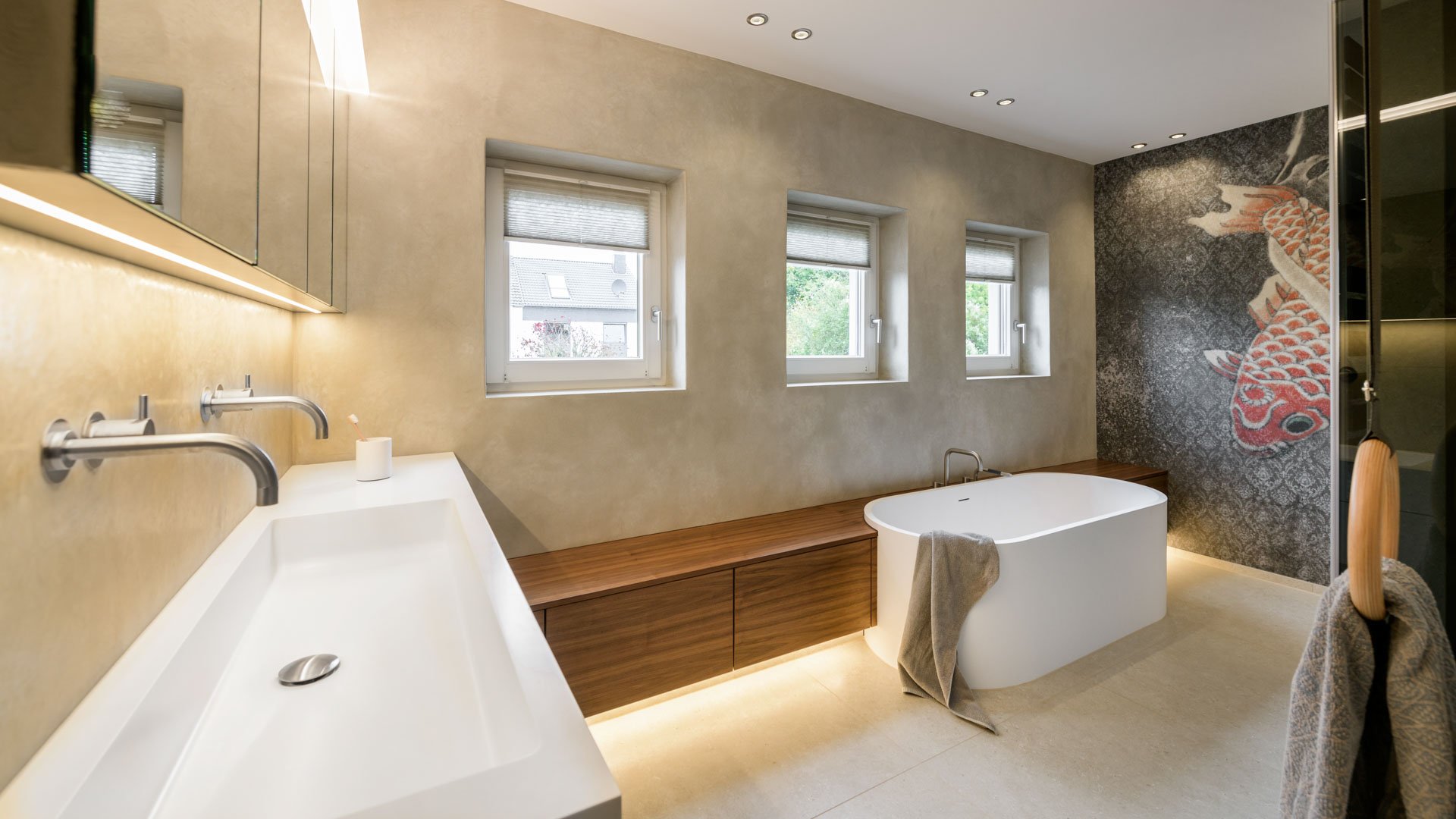 Mineralputz, mattweißes GFK und Holz kombiniert